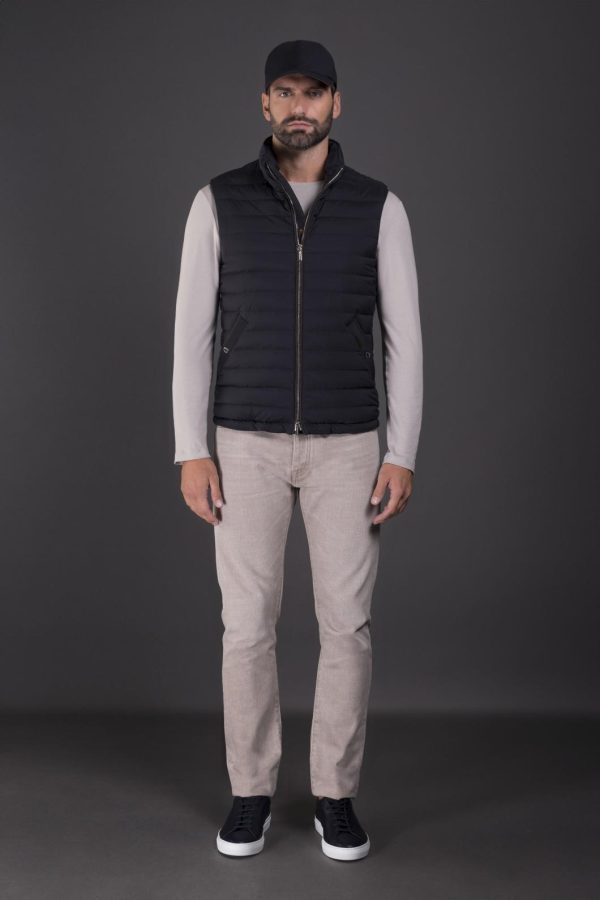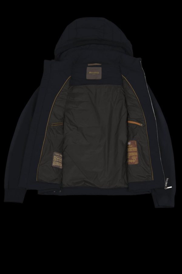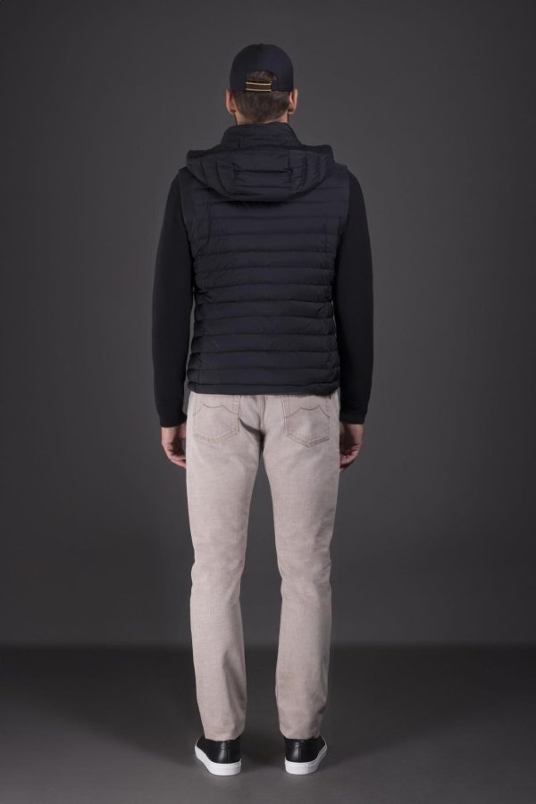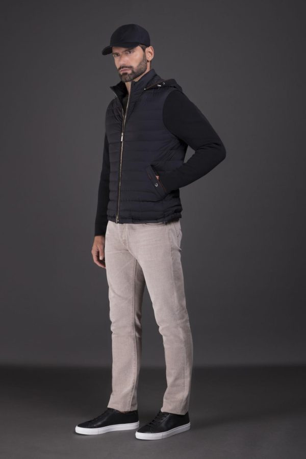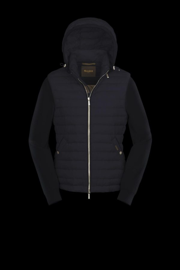 Bomber jacket with detachable hood and sleeves in a cotton blend knit, transforming the garment into a vest. The central part is crafted from ultra-lightweight matte technical fabric, down-proof and padded with goose down.