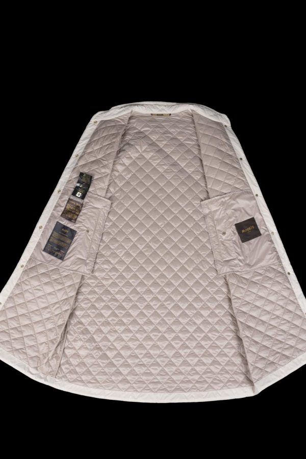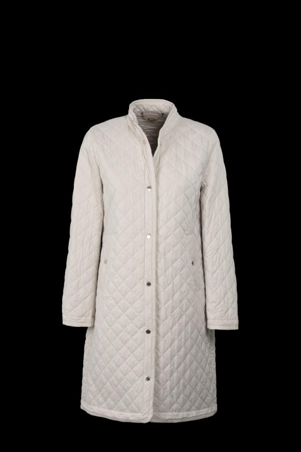 Made of iridescent microfiber technical fabric with silky appearance and refined peach hand, quilted in diamond pattern and padded with soft down-effect wadding.