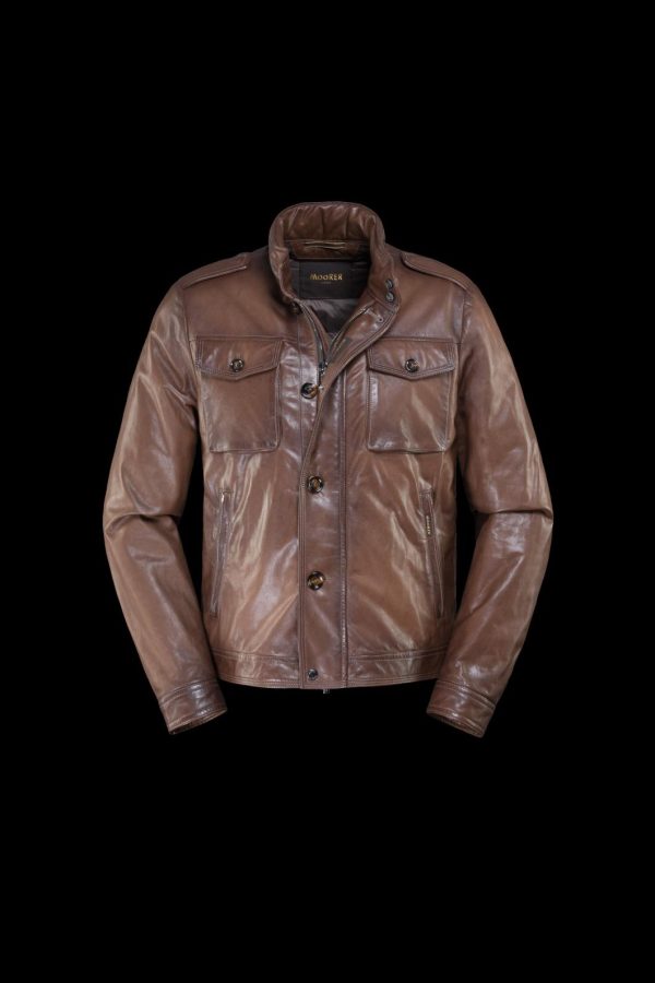 Semi-lined blouson with light down feather padding. Made of fine lamb leather, soft, smooth, and comfortable, treated with vegetable and chrome tanning and hand-tampoed.