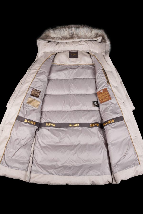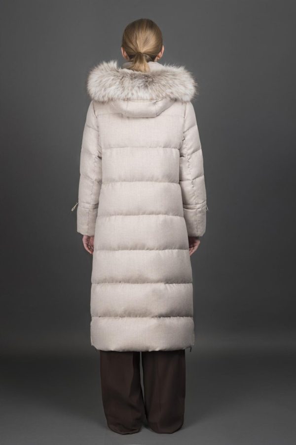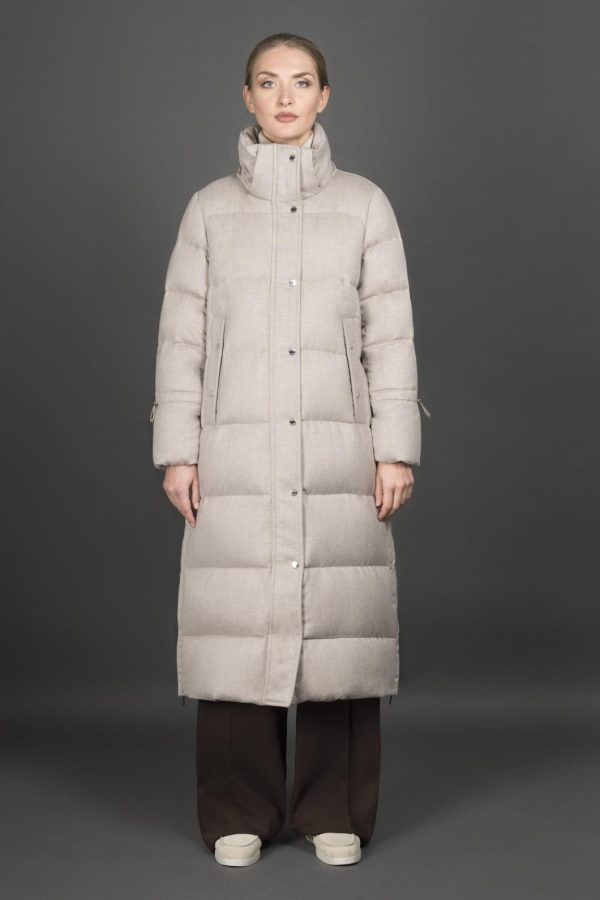 Long oversized down jacket. Padded with very fine quilted goose down in large boudin, it is made of ultra-light 100% cashmere flannel.
