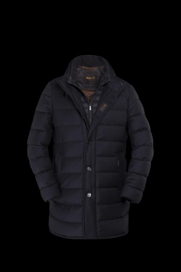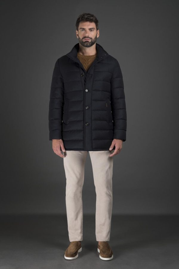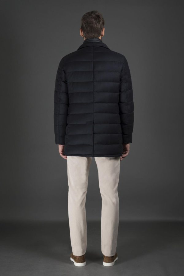 Single-breasted coat with a straight line, padded with goose down and boudin quilted. Made of virgin wool and cashmere flannel with a lightweight comfortable weave made from mélange-dyed yarns.
