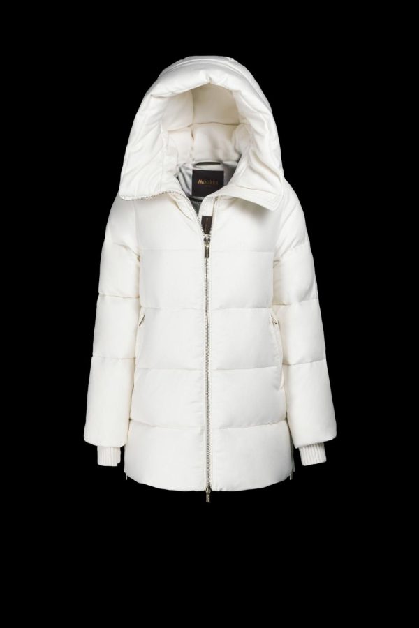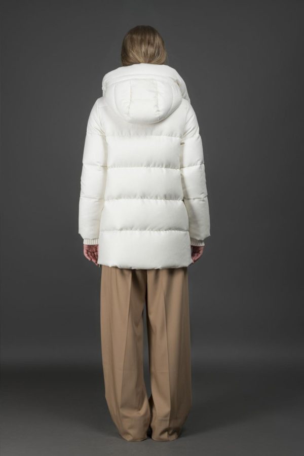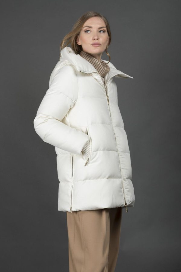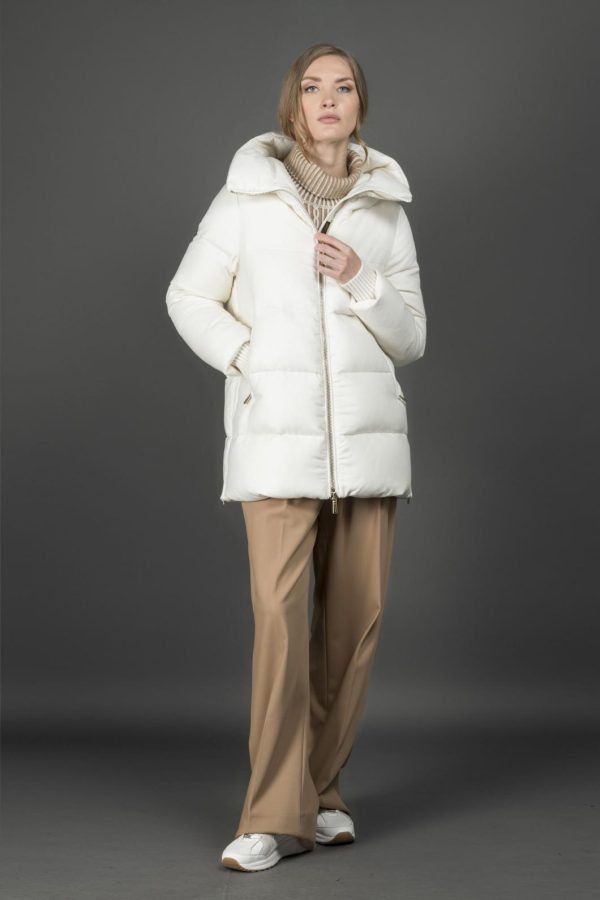 Coat with an essential and clean line, the perfect blend of practicality and elegance.Filled with soft down and quilted in large boudins.Crafted using a material of Excellence: rare and precious baby cashmere, with a twill weave, extremely soft and finer than traditional cashmere.Obtained by combing the fleece of the Hircus white goats from the desert region between Mongolia and northern China. Each kid produces only 0 grams of fiber, making this material very limited.