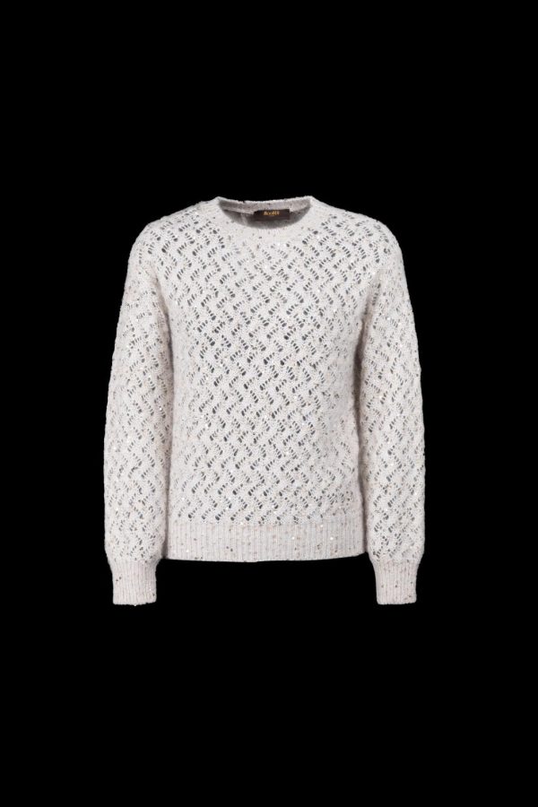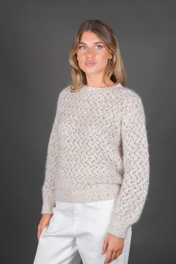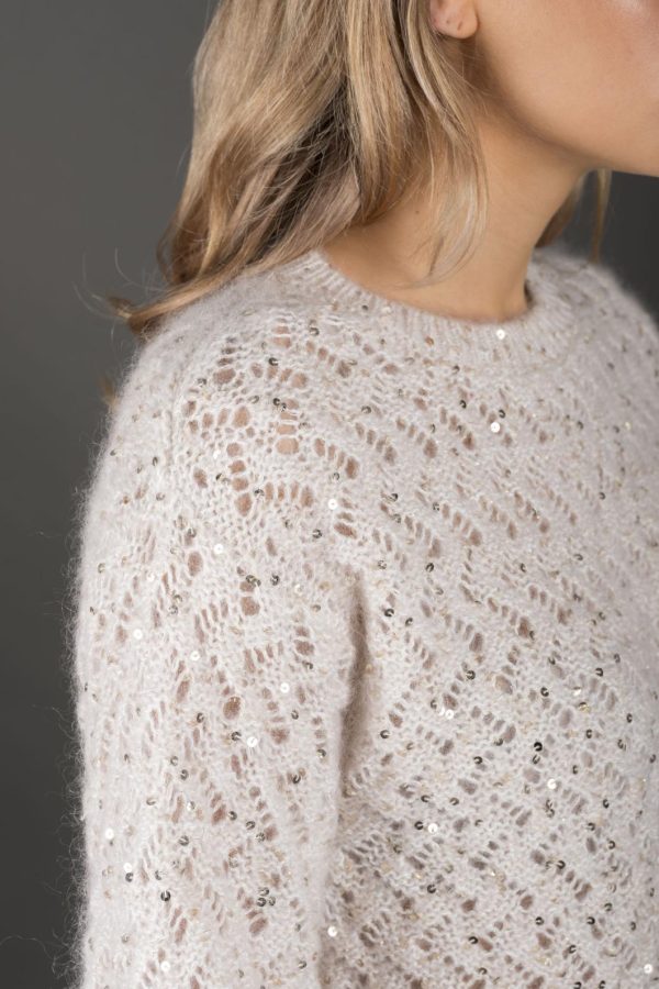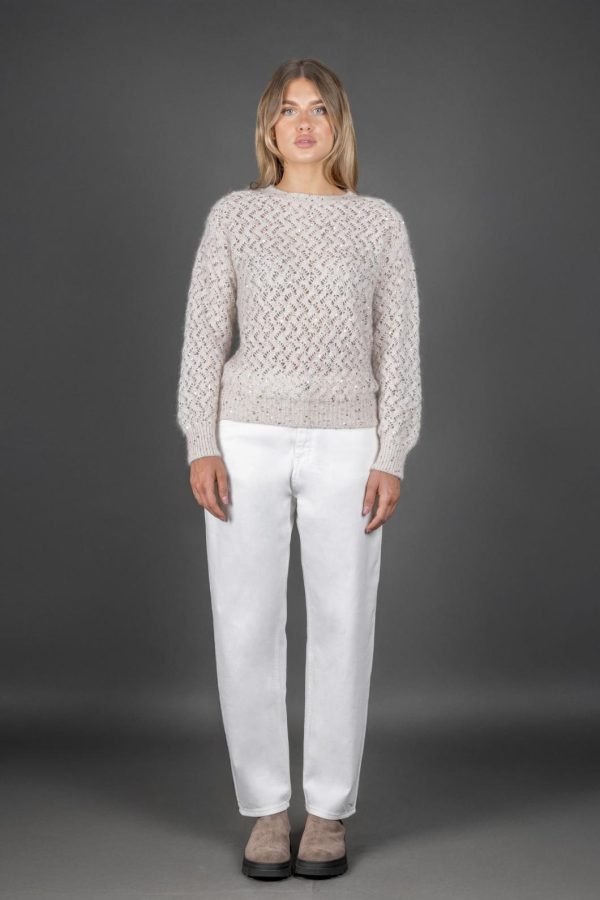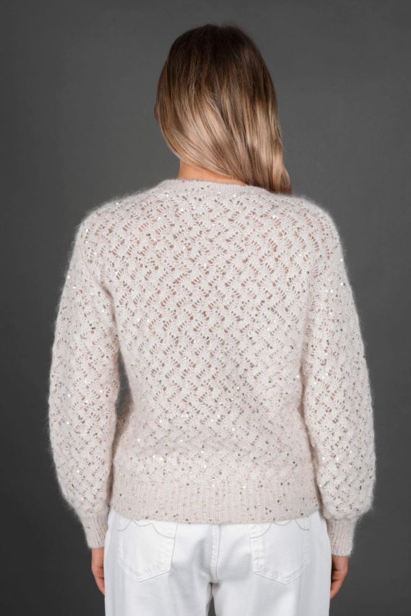 Crewneck sweater in lace stitch, made even more feminine by the presence of micro sequins that blend into the yarn and give a luminous finish to the surface. Made from an exclusive yarn composed of cotton, kid mohair, and silk.