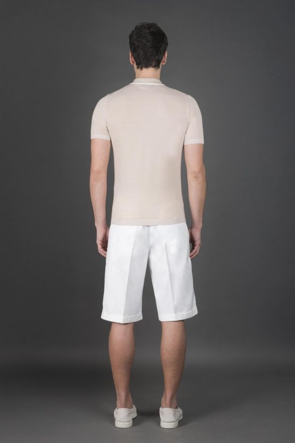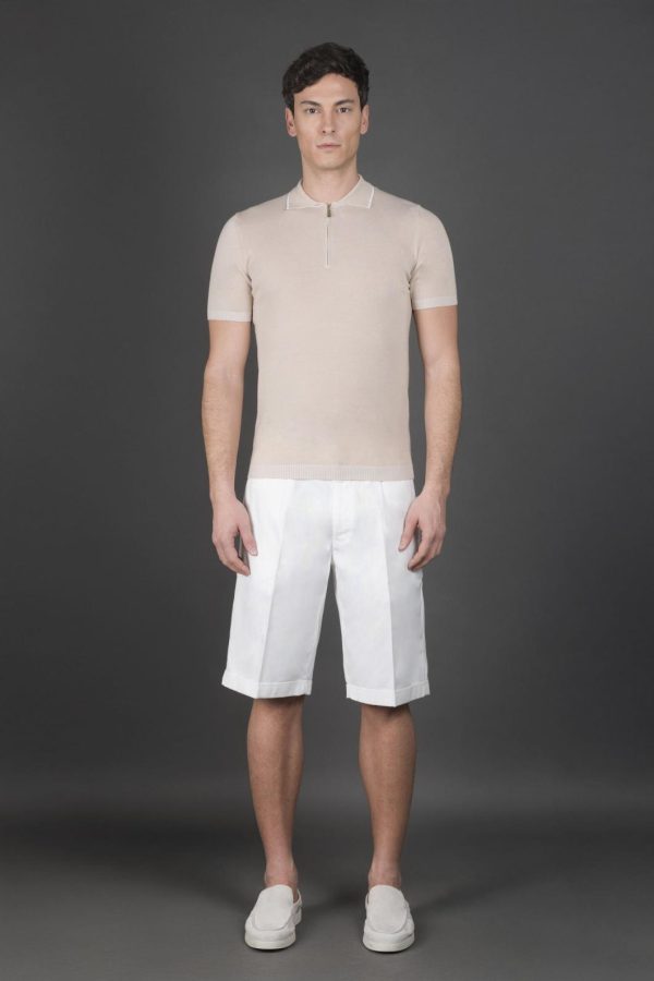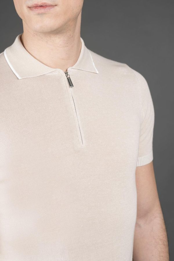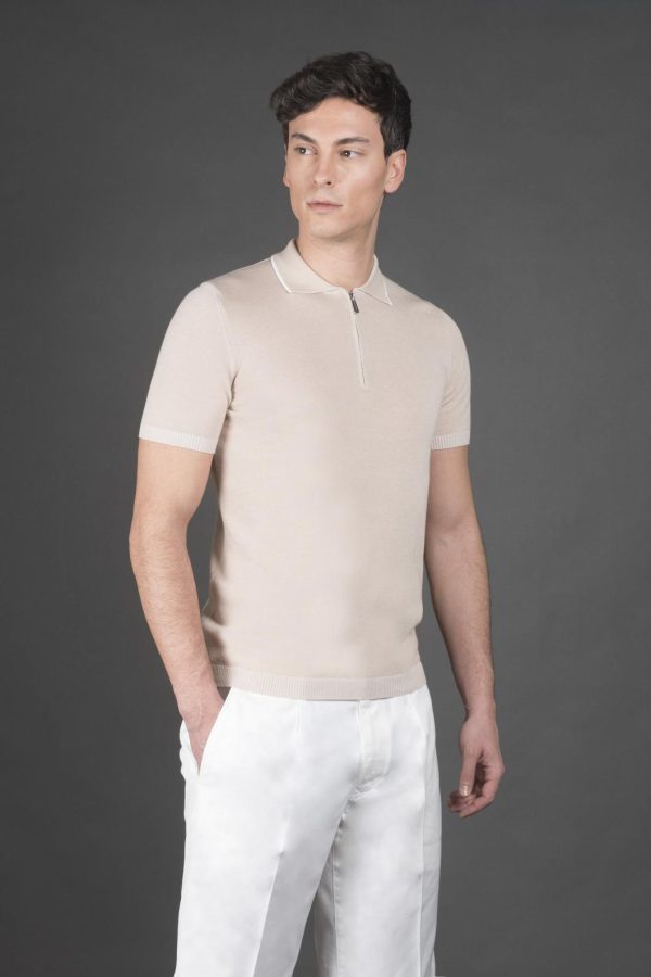 Polo-shirt with zipper. Made with a surprising yarn that combines two types of cotton: combed cotton and crêpe cotton. The first is thin, soft, and durable, while the latter makes the garment cool and lightweight.