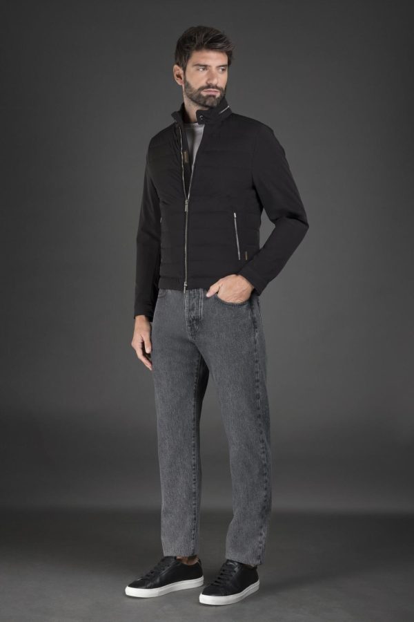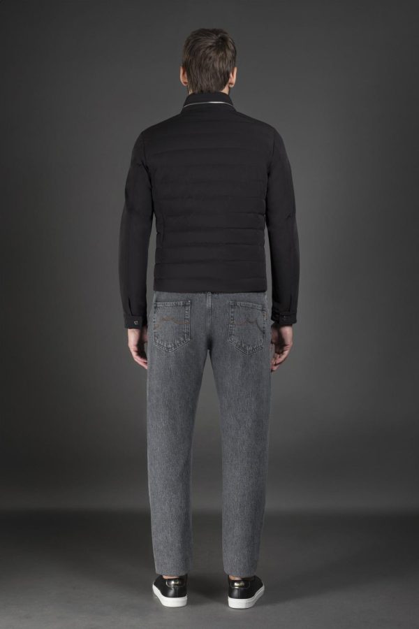 Blouson belonging to the Acqua line (1 umbrella), with smooth sleeves padded with thermal wadding and a body padded with goose down and quilted in boudin. Made of waterproof coated bi-elastic fabric, very compact and resistant to traction.