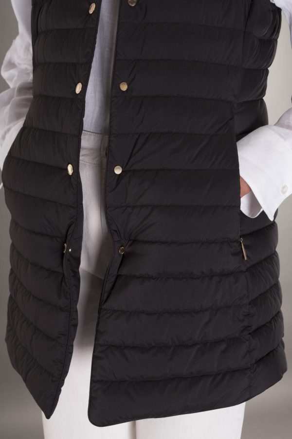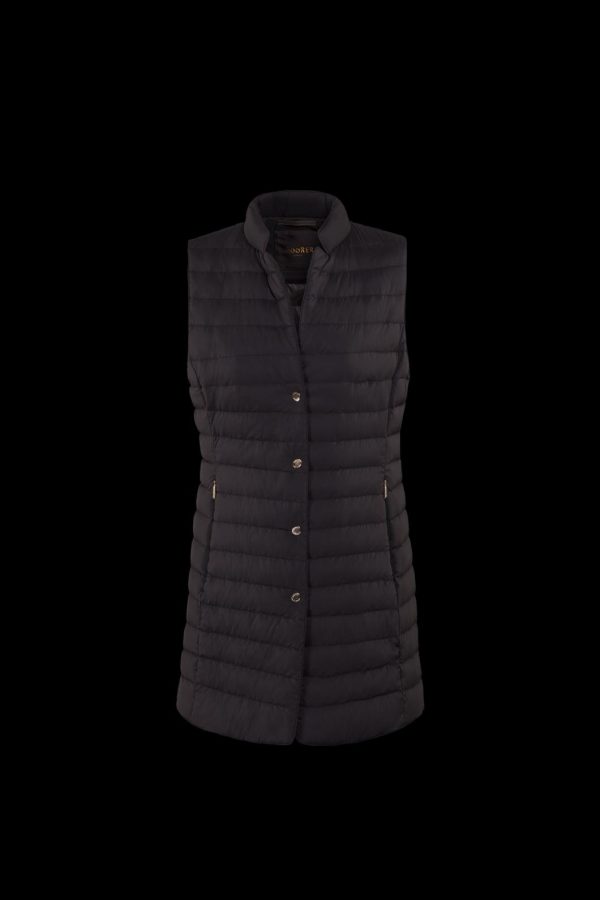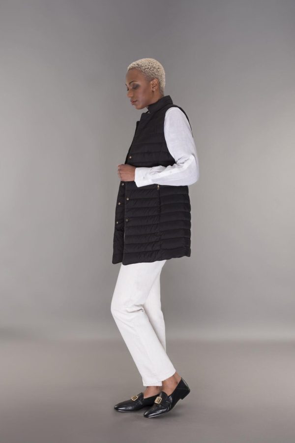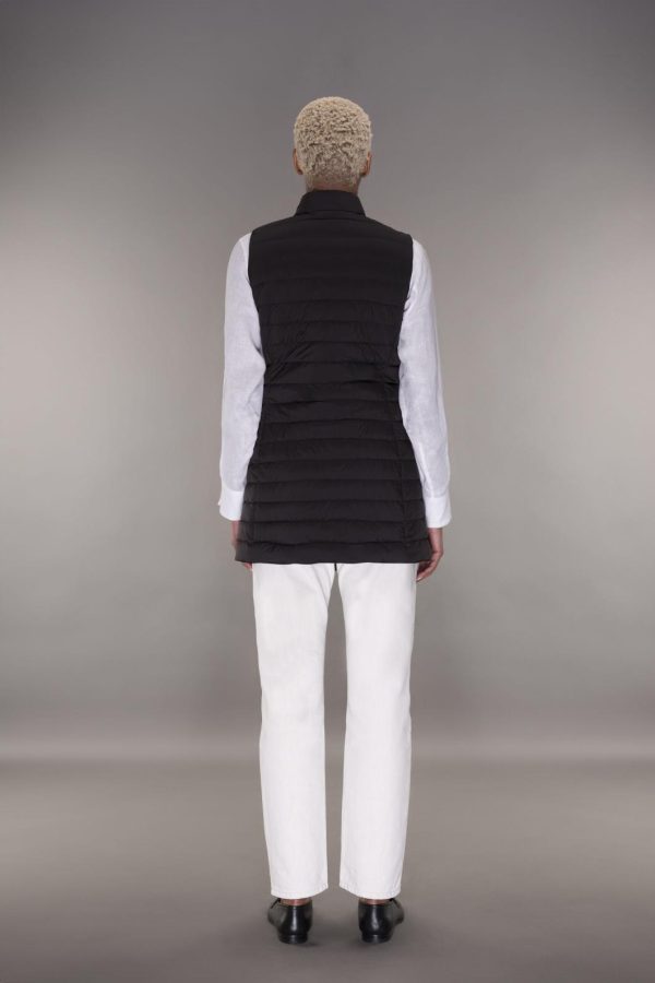 Long vest from the Acqua line (1 umbrella), quilted in boudin style and padded with goose down. Made from an extremely lightweight, matte down-proof fabric with an appearance similar to silk-like fabrics, with a subtle surface crumple effect that gives the garment its unique character.