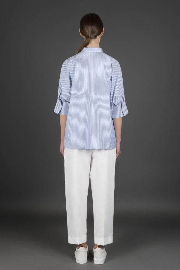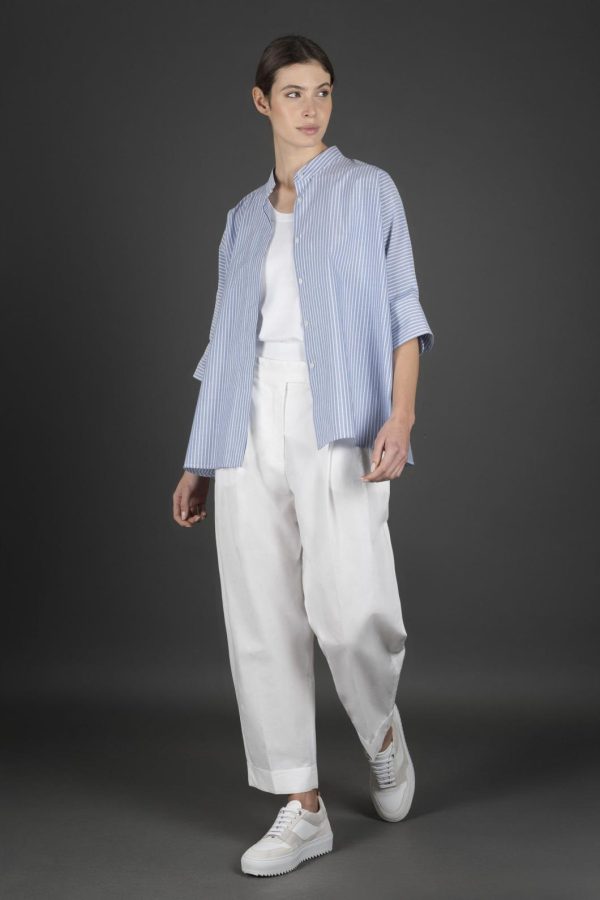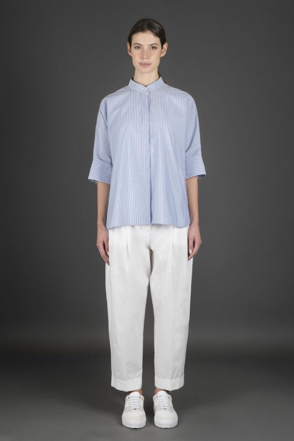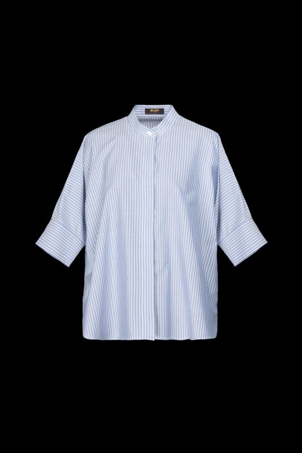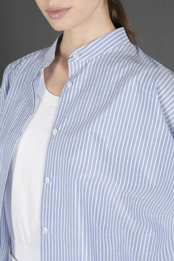 Shirt with a mandarin collar, made from striped poplin crafted in fine and durable cotton. It has a sturdier feel compared to classic poplin, but remains soft to the touch.