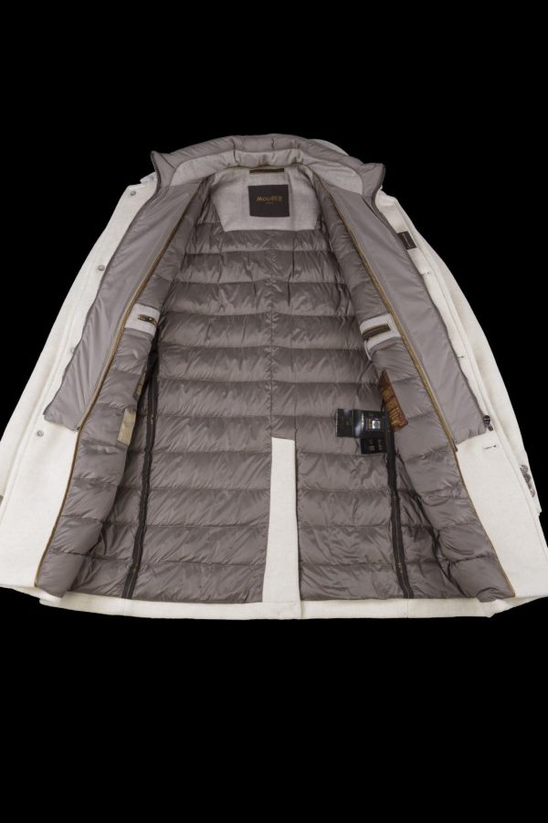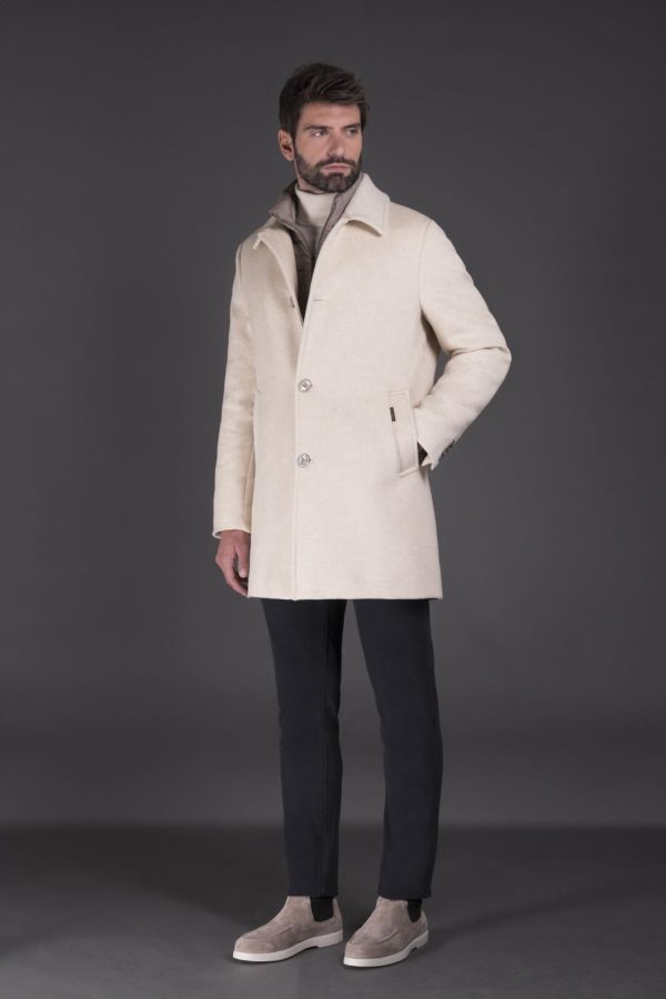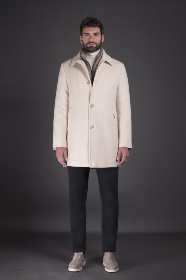 Single-breasted straight-fit coat with removable quilted fabric base layer, fastened with metal zip.