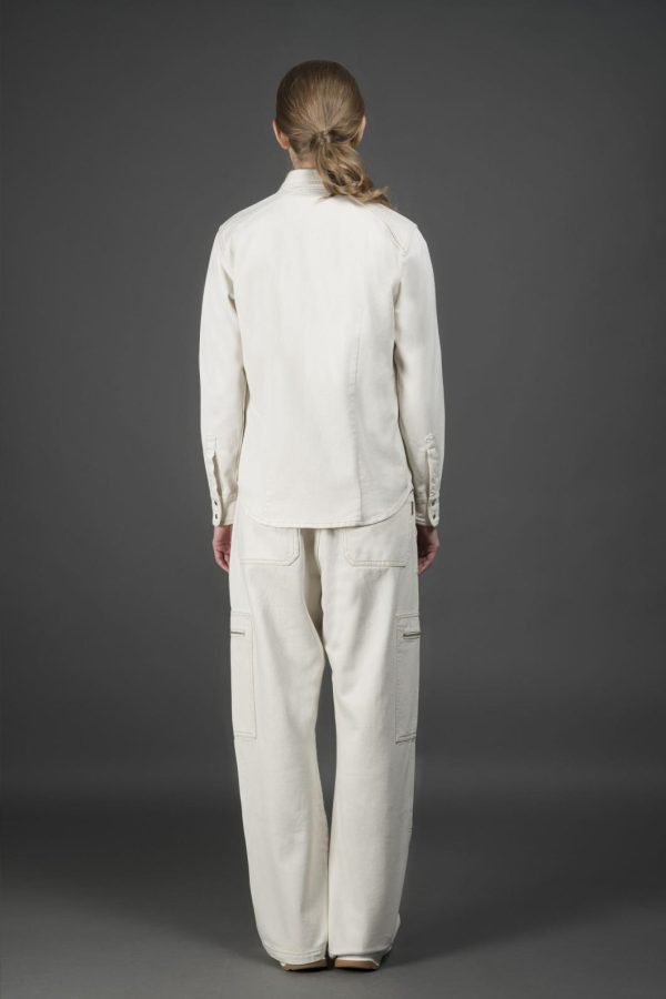 Crafted from lightweight yet durable 100% cotton écru natural denim, featuring a different thread count between warp and weft for a relaxed texture. Soft to the touch due to the shorter, thicker fibers, it tends to “swell” during fabric washes, giving it a vintage 80s-inspired look.