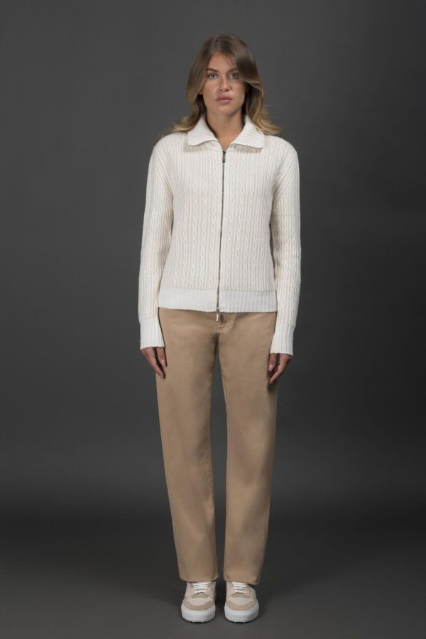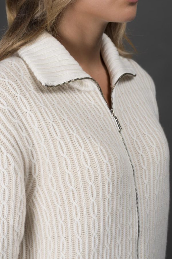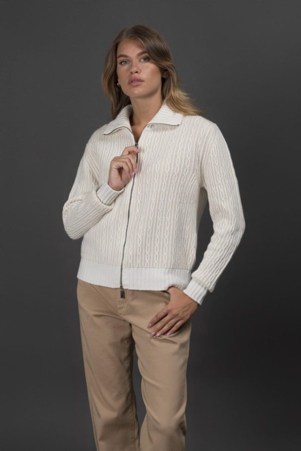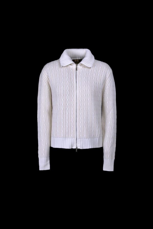 Zip-up blouson made from baby cashmere yarn with jacquard braid pattern and bicolor “Vanisé” effect.