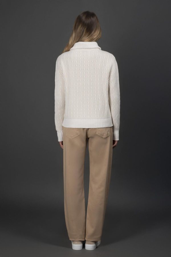 Tall ribbed collar in solid color matching the cable pattern, as well as the hem and cuffs