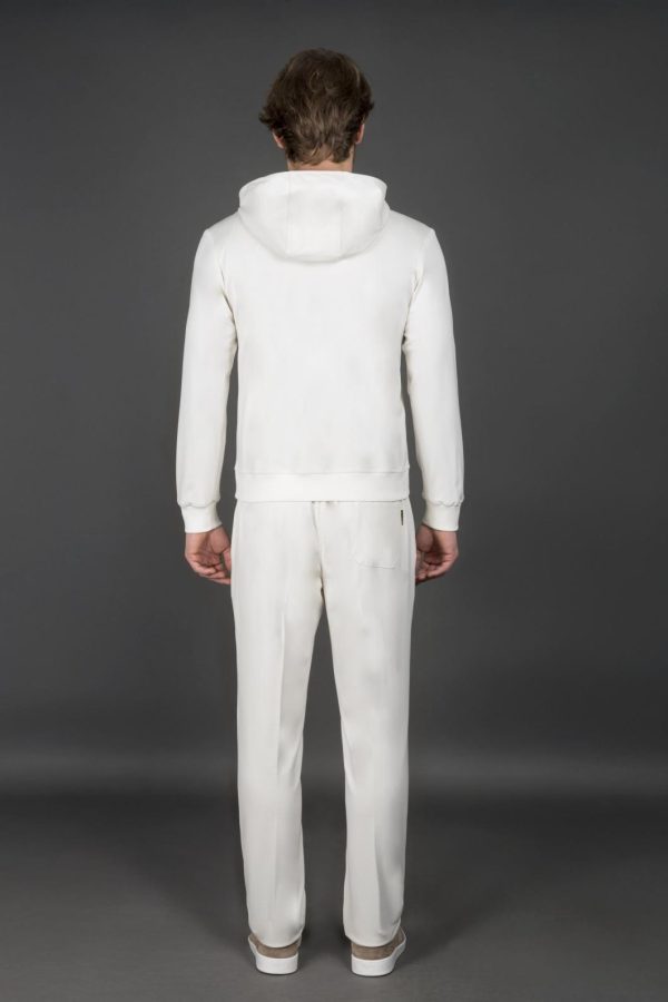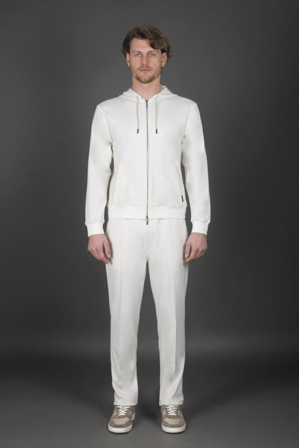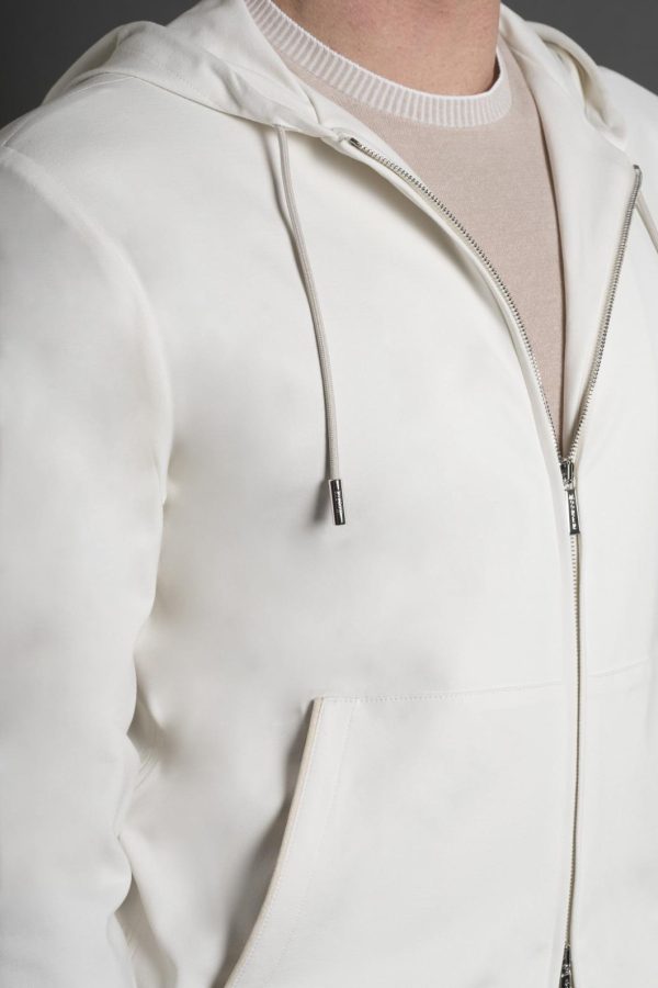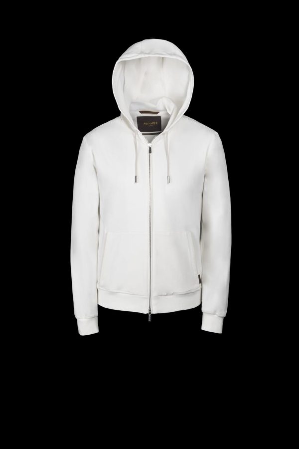 Topwear with a hood that strikes the perfect balance between performance and functionality. Made from interlock viscose and elastane polyamide, a fabric created using two opposing rows of needles that work alternately. This technique creates a very soft, puffy and highly elastic double-knit fabric.