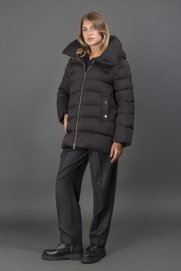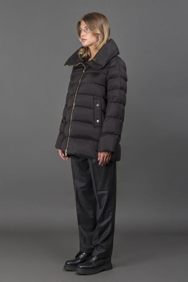 Down jacket with a trapeze silhouette and contemporary volume, made of silky down-proof matte nylon quilted in graded boudins.