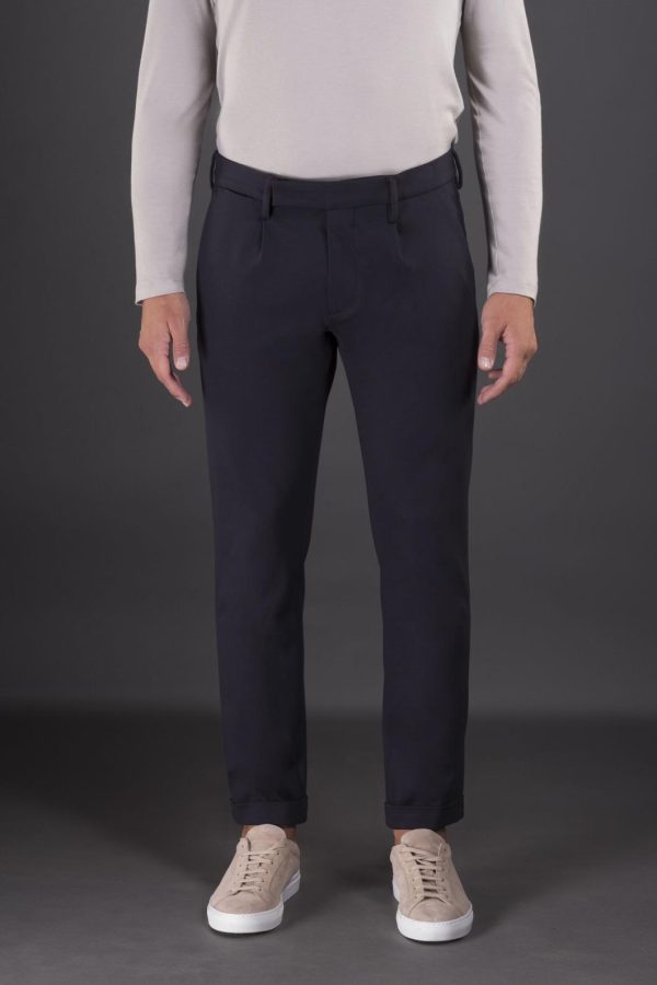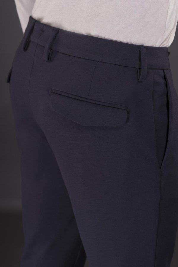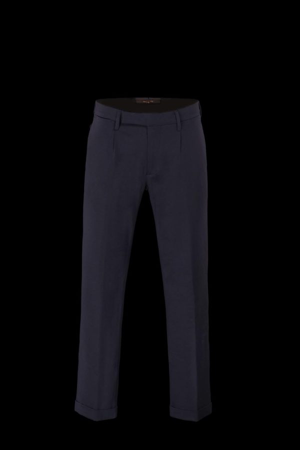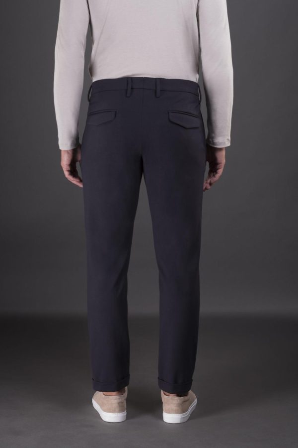 Modern-cut chino, with a very comfortable fit. Made in viscose and stretch polyamide interlock, a fabric obtained by using two opposing rows of needles that work alternately. This process creates a very soft, fluffy, and extremely elastic double-knit.