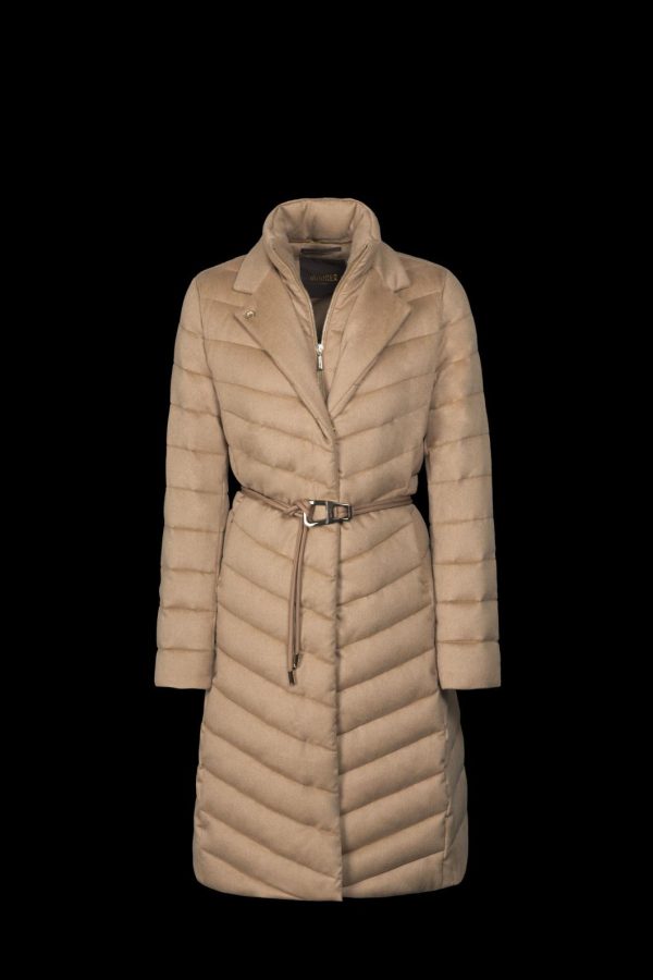 Slim-fit down coat with a metropolitan attitude, belonging to the Acqua line (1 umbrella).Filled with pure goose down and quilted with diagonal boudin. Made from 100% baby camel velour, the finest camel fiber, known for its extraordinary fineness and softness. This fiber, sourced from extreme climates, is naturally thermoregulating and is often considered an excellent alternative to cashmere. Its soft structure traps large amounts of heated air, offering unmatched comfort and warmth.