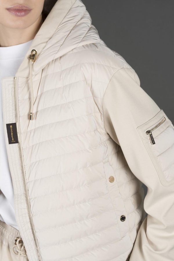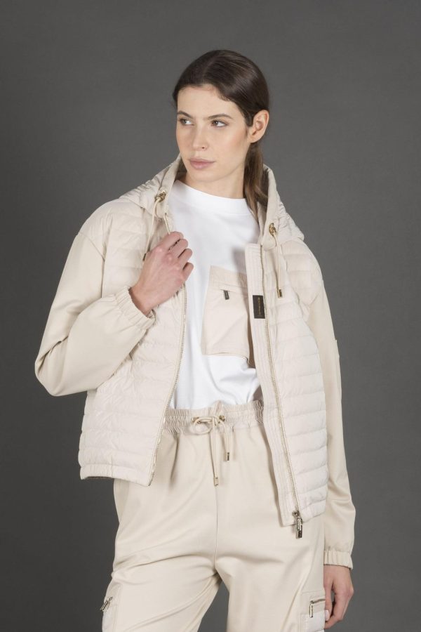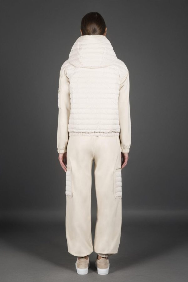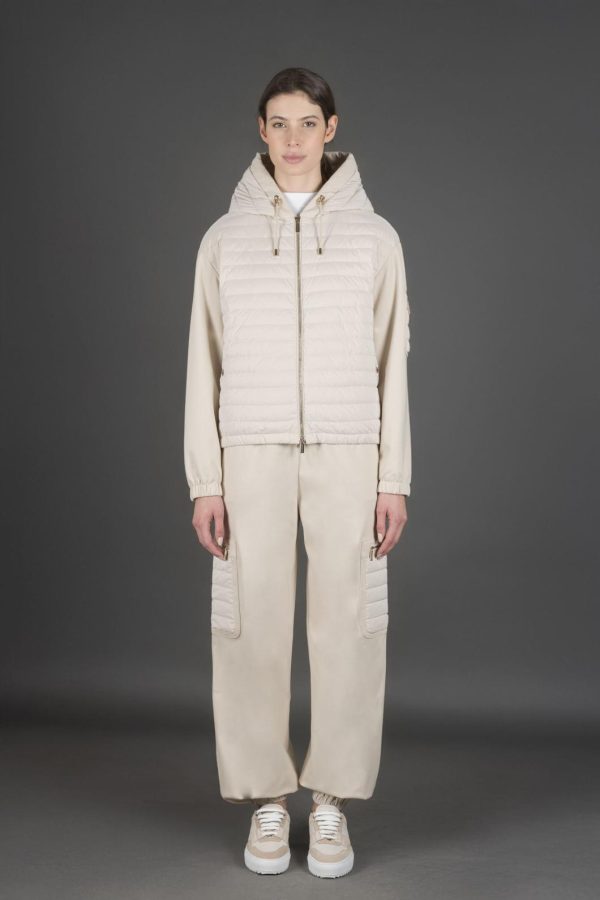 The body is made with a microfiber fabric with a briné effect, silky in appearance, quilted with boudin, and padded with finest goose down. The sleeves and hood are crafted with a compact and soft interlock made with natural and technological fibers that make it extremely performant.