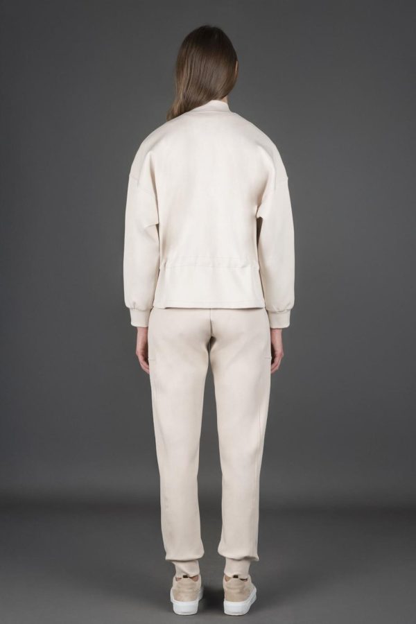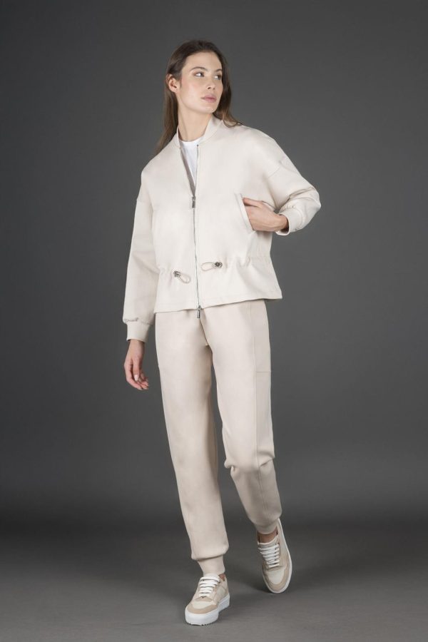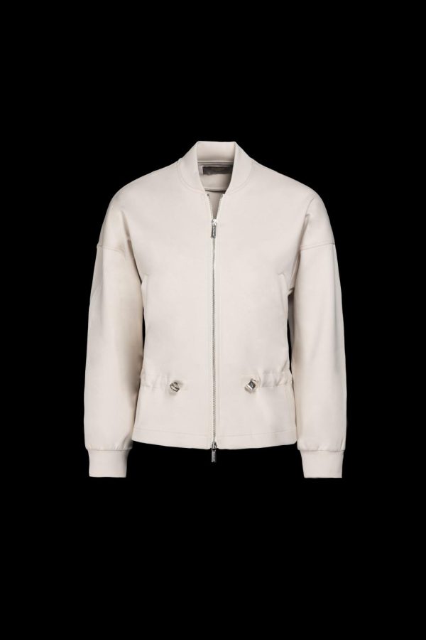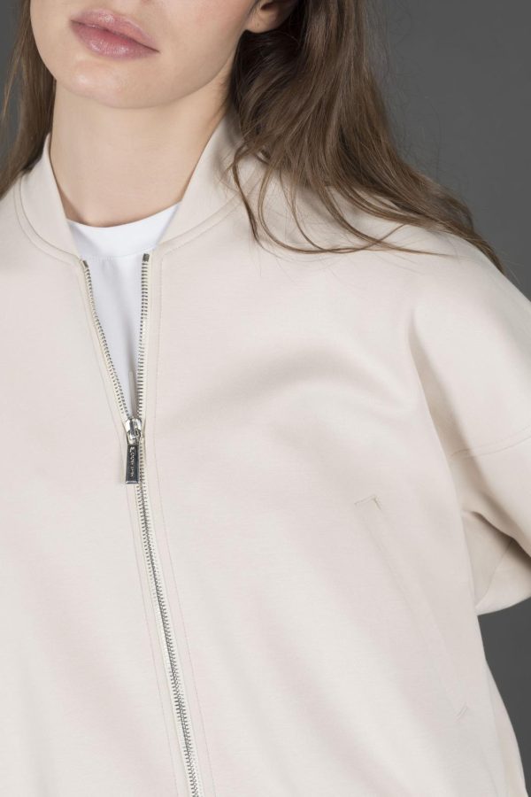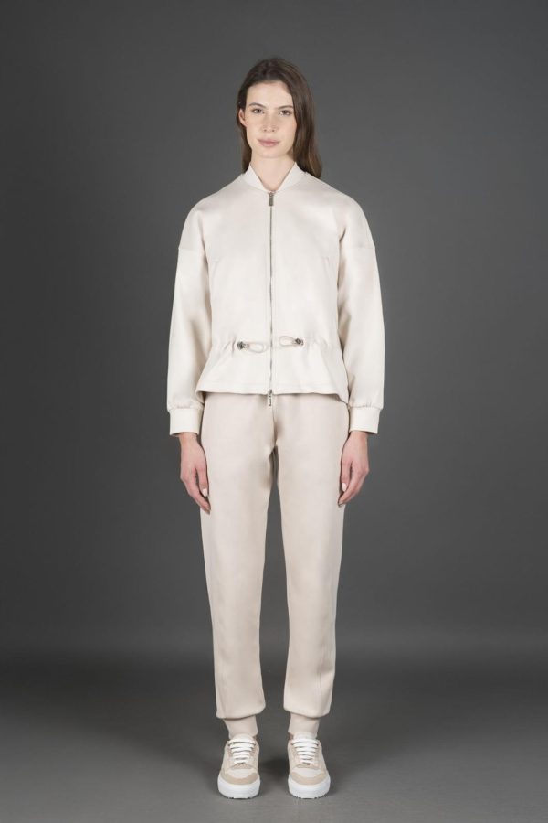 Modern bomber-sweatshirt, with a feminine silhouette accentuated by the drawstring at the waist.