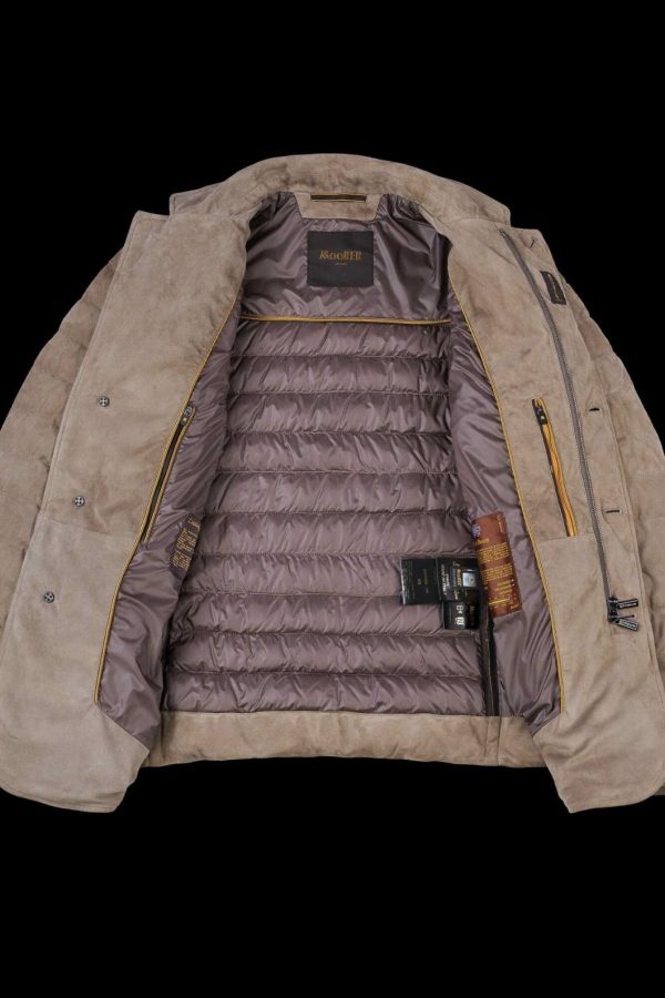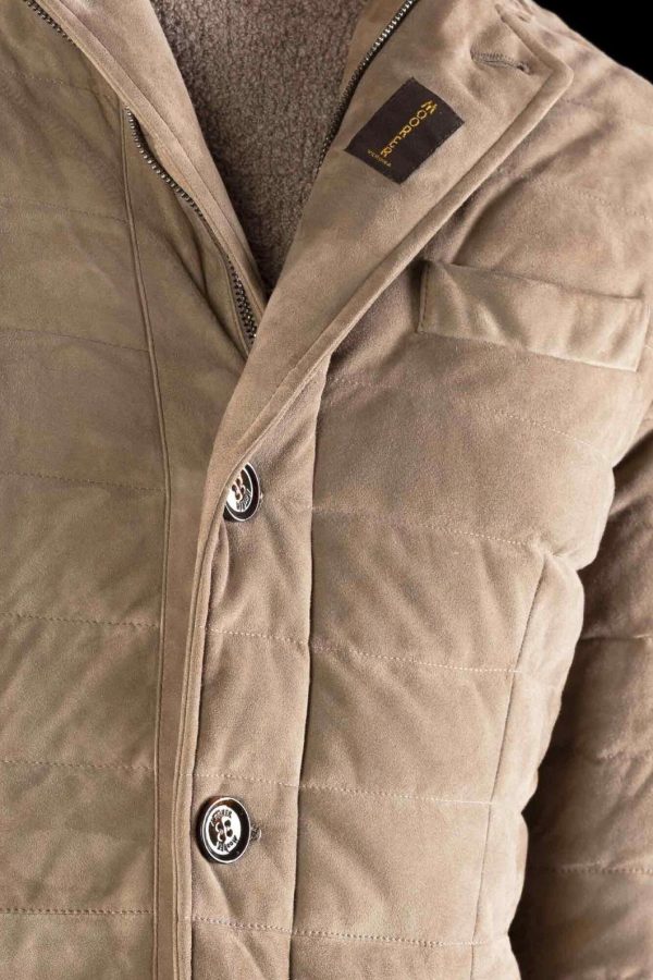 Three-button jacket in boudin-quilted suede. Direct-injection goose down padding. Nappa leather insert on neck. Front fastening with zip and horn buttons and double inner zips.