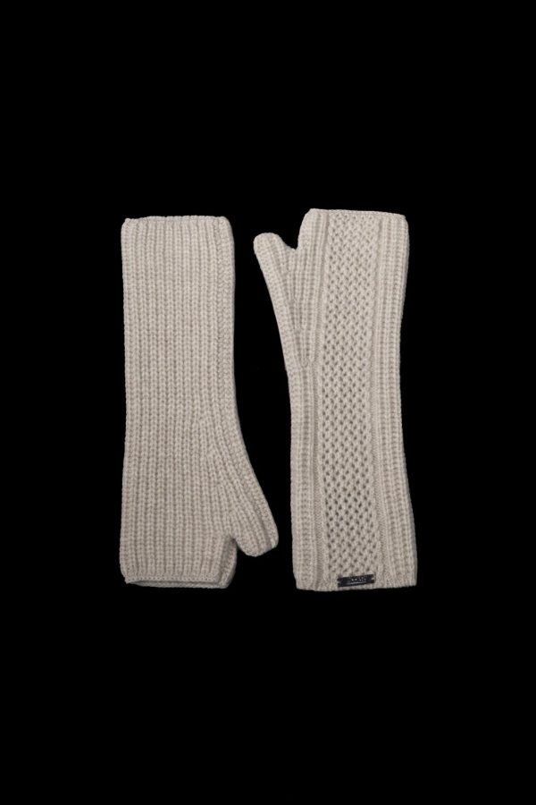 Long fingerless cashmere knit gloves adorned with a rich knitting that gives body and a three-dimensional appearance to the glove. The glove is soft, warm and comfortable.